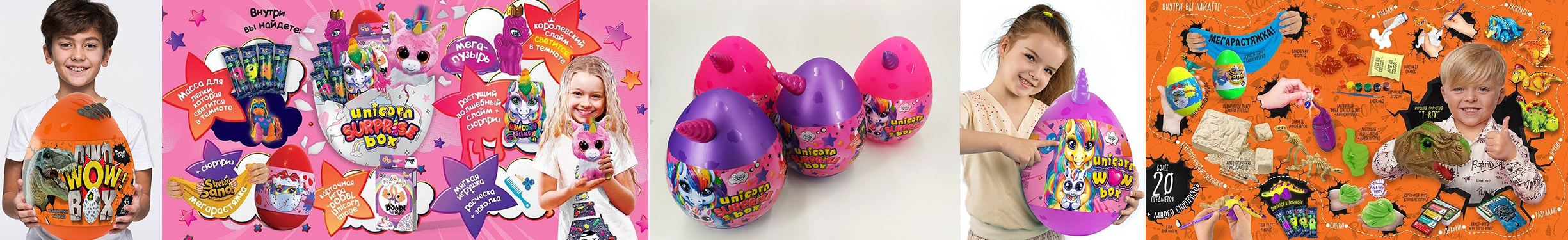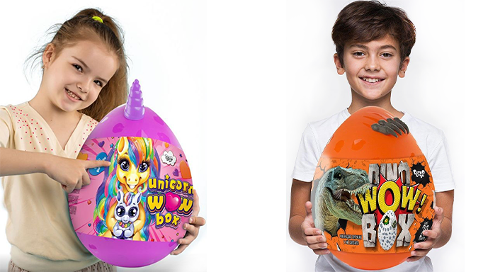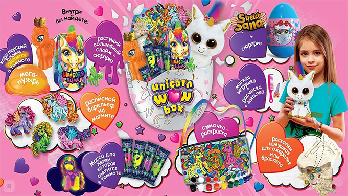 Не знаете с каким презентом прийти к ребенку или чем его занять дома? Подарите набор Unicorn Box - Бокс с Единорогом. Представлен в двух екземплярах:для мальчиков и девочек, и в двух размерах 29 и 35 см. В стандартном тематическом наборе, оформленном в виде яйца, находится 14 фантастических сюрпризов, в большом Wow наборе - 20 сюрпризов которые погрузят ребенка в яркий мир единорогов.